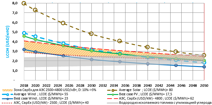 В настоящий момент существует конкуренция 2-х перспективных методов производства водорода: углеродный, (в частности, конверсия метана и пр.) и безуглеродный, электролизный, за счет электроэнергии, вырабатываемой, в первую очередь, с помощью ВИЭ.Предварительная модельная оценка и сравнение при параметрах ВИЭ, электролизеров и т.д., определенных на уровне, принимаемом международными энергетическими агентствами – МЭА, IRENA и пр показывают, что водород, вырабатываемый за счет ВИЭ, с учетом увеличения платы за выбросы и снижения капитальных затрат на ВИЭ, становится гораздо дешевле чем при углеродных способов выработки уже в среднесрочной перспективе.